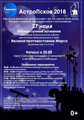«Команда 2018» позволила объединить ресурсы и усилия нескольких общественных организаций, волонтеров из Пскова и районов Псковской области и организовать интерактивную площадку «АстроПсков». Она будет работать в Пскове на горе Соколиха, рядом с монументом в память о Ледовом побоище вечером 27 июля. В этот вечер там будут организованы открытые наблюдения лунного затмения, планет Марс, Сатурн, Юпитер и других интересных астрономических объектов для всех желающих в телескопы.