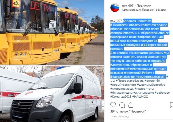 «В Псковской области грядет очередное обновление регионального парка спецтранспорта. Правительство РФ поддержало наше обращение и до конца года в регион поступят 18 школьных автобусов и 15 карет скорой помощи», — написал в своем инстаграме губернатор Псковской области Михаил Ведерников.