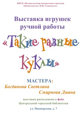 24 сентября центральная городская библиотека приглашает всех желающих познакомиться с игрушками ручной работы, выполненными мастерами Богдановой Светланой и Смирновой Дианой.