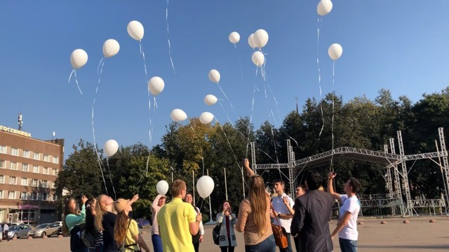 Десятки белых шаров выпустила в небо молодежь Великих Лук. Так ребята отметили Международный день мира.