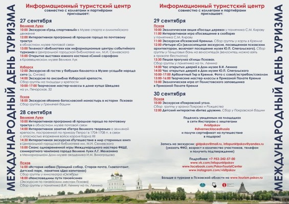 С 27 по 30 сентября в Пскове, Изборске и Великих Луках пройдут мероприятия, посвященные Международному дню туризма 2018.