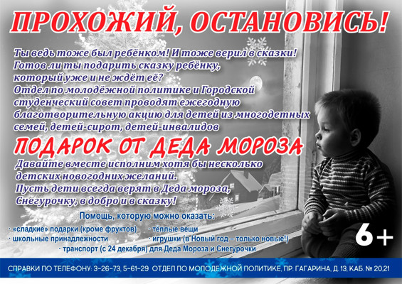Отдел по молодежной политике объявляет старт новогодней благотворительной акции «Подарок от Деда Мороза».