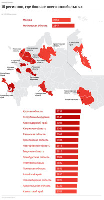На первом месте по числу людей, больных онкологией, стоит Курская область. В этом регионе больны раком 3239 человек.