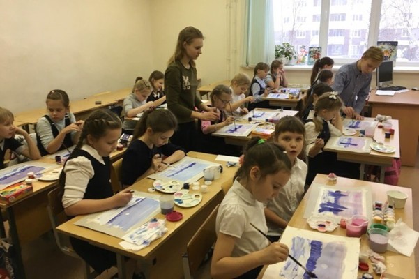 18 января волонтеры Молодежного отдела Великолукской епархии Максим Агафонов и Екатерина Бабинина вместе с руководителем студии «Рисующий Город ART» Екатериной Сергеевой провели мастер-класс для учеников начальных классов школы № 13.
