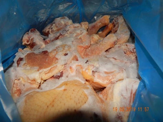 В ходе проведения ветеринарно-санитарного досмотра инспекторами Управления выявлены следы дефростации продукции: подтеки на транспортировочных коробках, обильное количество мутного льда на дне упаковки с продукцией. А также присутствие выраженного запаха, не свойственного данному виду товара, что является грубым нарушением требований ветеринарного сертификата США на экспортируемое мясо птицы и продукты из мяса птицы в Казахстан, статьи 17 Технического регламента Таможенного союза «О безопасности пищевой продукции».