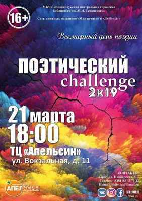 21 марта, в 18:00, в торговом центре «Апельсин» состоится акция «Поэтический сhallenge — 2k19» (16+). Поэтический challenge — это вызов себе и обществу, способ показать свои способности и творчество.