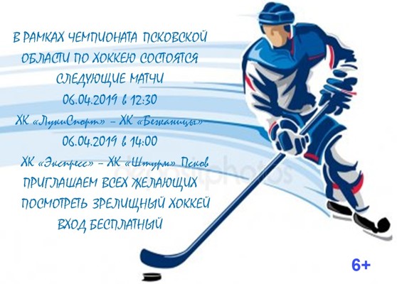 В эту субботу, 6 апреля, в спортивном комплексе «Айсберг» пройдут хоккейные матчи в рамках Чемпионат Псковской области по хоккею с шайбой. (6+)