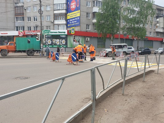 Сегодня, 14 мая, на проспекте Гагарина в Великих Луках рабочие дорожных служб обновляют разметку пешеходного перехода.
