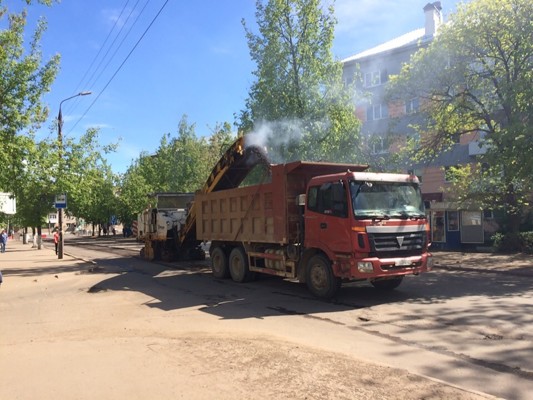 На улице Зверева в Великих Луках снимают асфальт