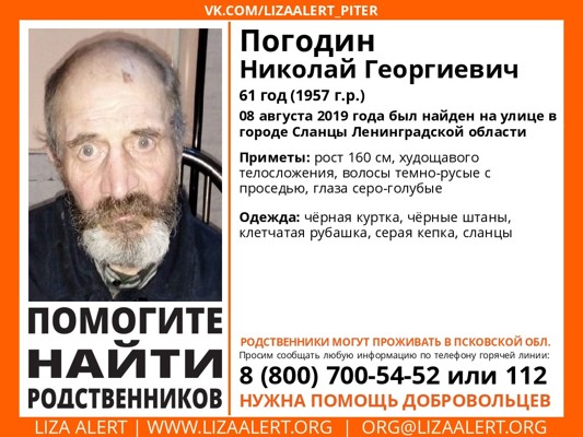 8 августа в городе Сланцы Ленинградской области был найден 61-летний Николай Погодин. В течение недели мужчина ютится на улице и в магазинах, сообщается в группе поискового отряда «Лиза Алерт».