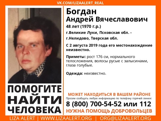 По информации волонтеров, он может находиться в Великих Луках или в Нелидово (Тверская область). Приметы: рост 176 см, нормальное телосложение, волосы русые с залысинами, глаза голубые.