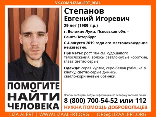 Разыскивается великолучанин Евгений Игоревич Степанов. 29-летний Евгений ушел из дома 4 августа, с тех пор его не могут найти, сообщает поисковый отряд «Лиза Алерт» Псков.