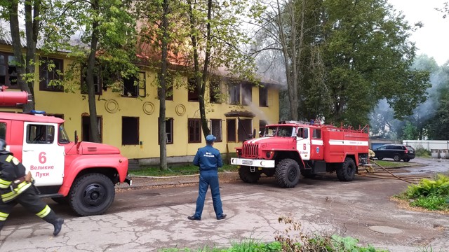 Сейчас на улице Льва Толстого в Великих Луках горит расселенный барак. Двухэтажный аварийный дом №20 тушат экипажи двух пожарных машин.
