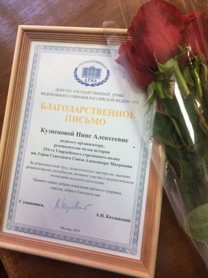 За добросовестный труд ,педагогическое мастерство, высокие организаторские способности, активное участие в патриотическом воспитании молодого поколения Нину Кузнецову наградили Благодарственным письмом депутата Госдумы РФ Александра Козловского.