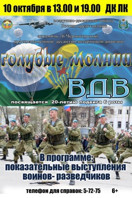 10 октября в ДК ЛК в 13:00 и в 19:00 состоятся концертные программы вокально-инструментального ансамбля 76-й Черниговской Краснознаменной десантно-штурмовой дивизии «Голубые молнии» (6+), с показательными выступлениями по рукопашному бою. Перед великолучанами выступят воины-разведчики.