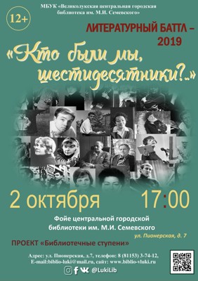 Великолукская центральная городская библиотека им. М.И. Семевского приглашает великолучан принять участие в литературном баттле «Кто были мы, шестидесятники?..», (12+) который состоится в Великих Луках уже в третий раз.