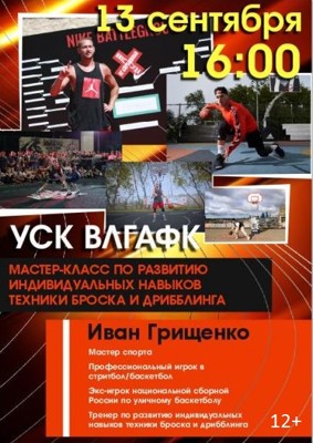 На базе УСК ВЛГАФК 13 сентября в 16:00 состоится мастер-класс по развитию индивидуальных навыков техники броска и дриблинга баскетболистов от Ивана Грищенко (12+).