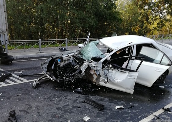 12 сентября под Псковом произошло серьезное ДТП. По сообщениям очевидцев, столкнулись легковушка и фура. Легковой автомобиль после столкновения «смяло».