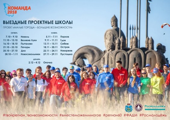 С октября по декабрь проектный офис «Команда 2018» посетит 13 городов Псковской области с трехдневными проектными школами. Эксперты проведут с участниками практические занятия, мастер-классы и волонтерские акции с целью обучения навыкам социального проектирования. Итогом проекта станет отбор 13-ти кураторов «Команды 2018» от муниципальных образований, сообщают на сайте пресс-службы Администрации Псковской области.