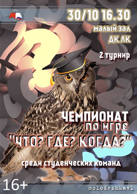 30 октября в Великих Луках состоится 2 тур чемпионата по игре «Что? Где? Когда?» (16+). Клуб интеллектуальных игр будет проходить в малом зале ДК ЛК, среди знатоков студенческой молодёжи города Великие Луки.