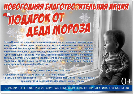Отдел по молодежной политике объявляет старт новогодней благотворительной акции «Подарок от Деда Мороза» (0+).