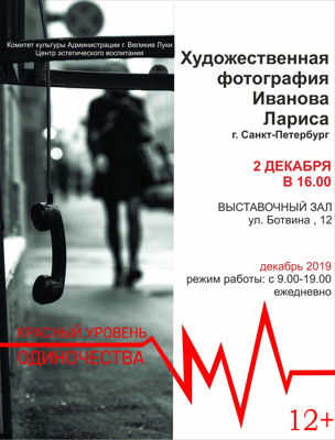 В Великих Луках 2 декабря в 16.00 в выставочном зале Центра эстетического воспитания состоится открытие выставки художественной фотографии Ларисы Ивановой (г. Санкт-Петербург) «Красный уровень одиночества» (12+). Экспозиция посвящена проблеме одиночества в большом городе.