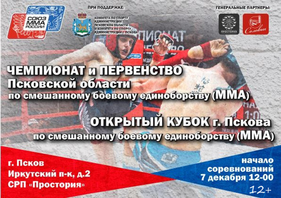 В Пскове 7 декабря пройдут Чемпионат и Первенство Псковской области по смешанному боевому единоборству (MMA). Соревнования состоятся на площадке СРП «Простория» (12+).