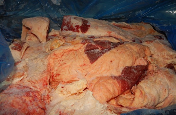 В ходе ветеринарно-санитарного досмотра подконтрольной продукции сотрудником Управления была обнаружена упаковка (картонная коробка) с маркировочной этикеткой «Frozen Beef Fat». Продукция, содержащая в упаковке, по органолептическим показателям не соответствовала сведениям, заявленным в товаросопроводительных документах. А именно, вместо заявленного в документах и указанного на маркировке товара говяжьего жира, внутри коробки был обнаружен замороженный блок, состоящий из кусков различной формы, с преобладающим содержанием мышечной ткани темно-красного цвета.
