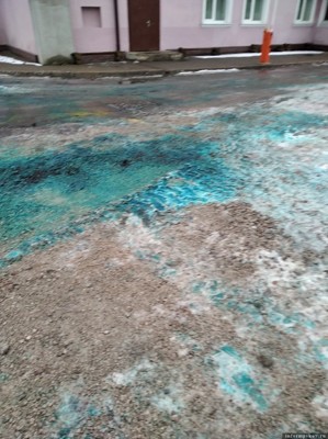 Псковичи выдвигают версии, по какой причине лед на одной из улиц покрылся синим налетом