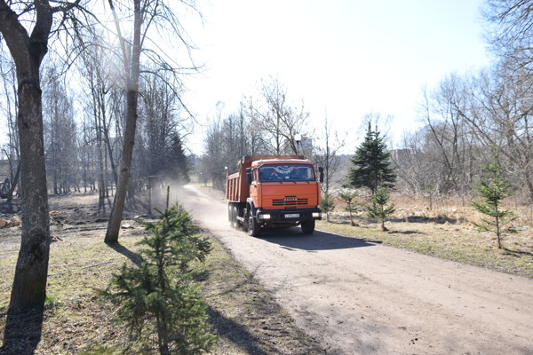 Строители работают по организации осуществления проекта. Сейчас они продолжают расчистку территорий и вывозят строительный мусор, а также убирают спиленные старые деревья.