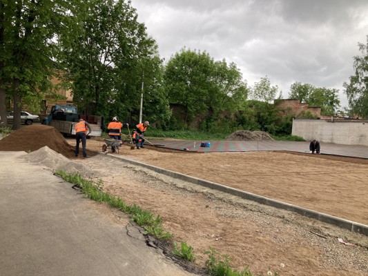 На детской площадке на улице Энгельса приступили к укладке резинового покрытия