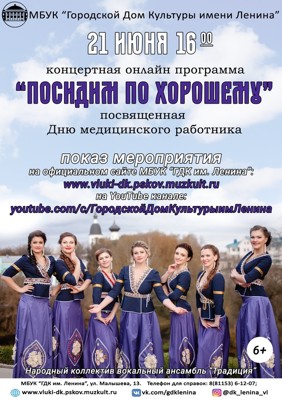 Концертная онлайн программа «Посидим по хорошему», посвященная Дню медицинского работника (6+). Данный концерт является сольным Юбилейным концертом Народного коллектива вокального ансамбля «Традиция», премьера которого состоялась в 2016 году. Руководитель коллектива Елена Савченко, является обладателем почётного звания «Душа земли Псковской».