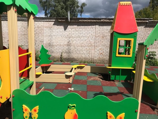 На площадке на улице Энгельса около дома №19 уже уложили резиновое покрытие, сейчас рабочие устанавливают детские игровые комплексы.