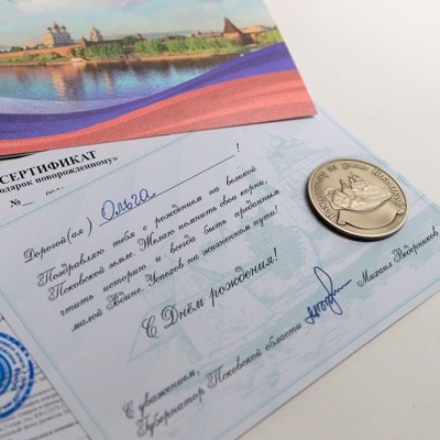 С 2019 года 7,5 тысяч семей уже получили подарочные наборы. Они вручаются родителям новорожденных. Наборы включают сертификат номиналом 5 тыс рублей от Фонда развития Псковской области, поздравительную открытку и памятную медаль «Рожденному на земле Псковской». На медали предусмотрено место для гравировки имени и даты рождения малыша.