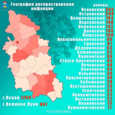 По состоянию на 13 августа в Псковской области официально подтверждено 4070 случаев заражения covid-19. Наибольшее число заболевших зарегистрировано в Пскове — 1269, в Великих Луках — 807, а также в Псковском районе — 344.