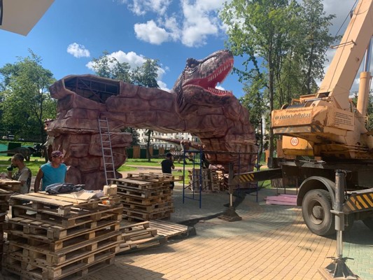 Рабочие сегодня продолжают монтаж входной группы выставки динозавров в Великих Луках.