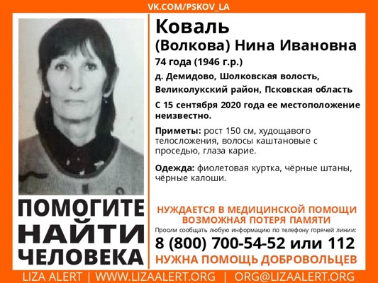 В районе деревни Демидово Шелковской волости 15 сентября ушла из дома и потерялась 74-летняя женщина — Нина Ивановна Коваль. Она страдает потерей памяти, возможно нужна медицинская помощь. Об этом сообщает поисковый отряд «ЛизаАлерт» Псковской области.
