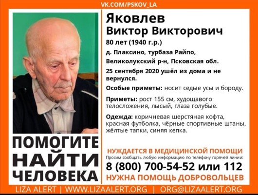 25 сентября из дома в деревне Плаксино Великолукского района ушел и не вернулся 80-летний Виктор Яковлев.