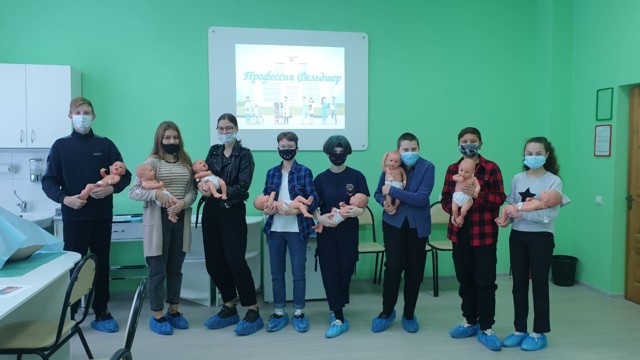 Школьники опробовали себя в качестве фельдшера на фельдшерско-акушерском пункте, консультировали молодую маму с грудным ребёнком. Также в роли медицинских сестёр (медицинских братьев) ребята помогали осваивать средства реабилитации (роллаторы, ходунки, костыли) пожилым людям с нарушениями координации движения и травмами нижних конечностей.