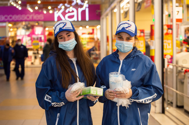 Участники акции посетили торговый центр «Апельсин», в котором раздавали средства индивидуальной защиты — маски и перчатки работникам торговых павильонов.