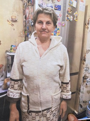 Была в тапках, светлом халате и красной кофте. На левой стороне лица есть заметная бородавка.