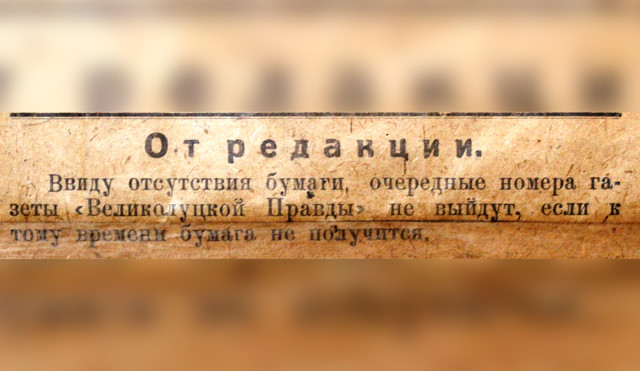 Государственный архив Псковской области опубликовал снимок газеты «Великолукской правды» 1920-1922 годов.