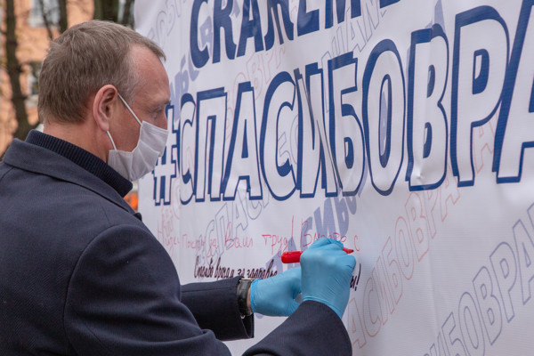 На баннере Александр Козловский написал: «Низкий поклон за ваш труд! Вместе справимся! Берегите себя!»