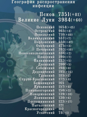 Больше всего в регионе зафиксировано заболевших COVID-19 в областном центре. За сутки выявили вирус у 81 человека. Из районов наибольшее количество человек заразившихся коронавирусом оказалось в Псковском: суточный прирост составил +45 зараженных, общее число заболевших — 1654.