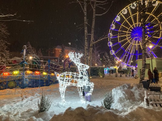 В городском парке культуры и отдыха появились светящиеся фигуры оленей, большой елочный шар и бойзбенд снеговиков.