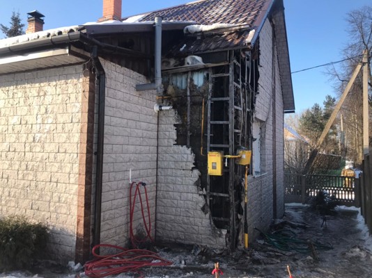 0В результате пожара выгорела пластиковая отделка наружной стены дома на площади. Причина пожара стало нарушение требований пожарной безопасности при проведении огневых работ.