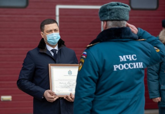 Михаил Ведерников наградил спасателей, ликвидировавших последствия ледяных дождей в январе этого года