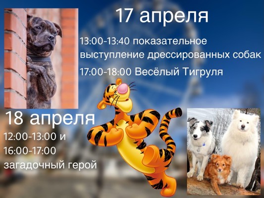 017 апреля, в субботу с 13:00 до 13:40 для гостей Луки Парк выступят дрессированные собаки. В этот же день с 17:00 до 18:00 парк посетит сказочный герой - Тигруля! Он всегда готов делиться безудержной радостью с ребятами.
