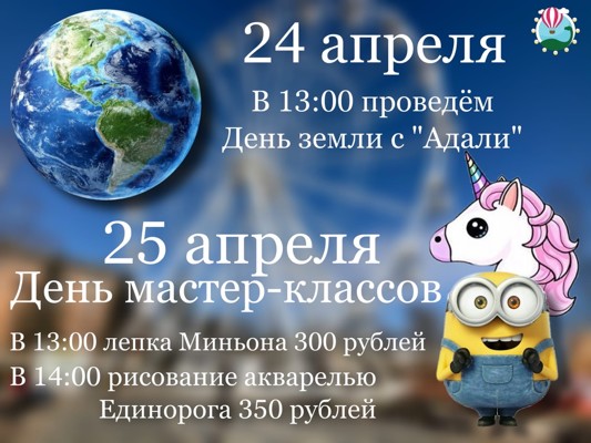 0В воскресенье, 25 апреля, пройдет День мастер-классов. В 13:00 парк приглашает на мастер-класс по лепке Миньона (0+) для деток от 5 лет. А в 14:00 пройдёт мастер-класс по рисованию акварелью Единорога (0+). Мастер-классы проведет педагог дополнительного образования высшей категории Наталья Ермакова.