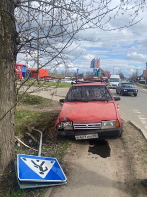 2ВАЗ-2108 двигался по улице 3-ей Ударной Армии в сторону магазина «Стройсам». В этот момент автоледи совершала маневр, который спровоцировал аварийную ситуацию. Водитель ВАЗа, уходя от столкновения вылетел на тротуар, где сбил дорожный знак и врезался в дерево.